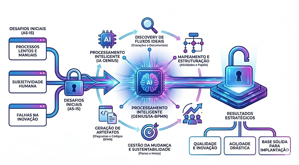 Gestão da Mudança e Sustentabilidade: A IA é utilizada para consolidar metas de desempenho (KPIs) e planos de adoção, garantindo que o novo processo seja sustentável, monitorável e evolua continuamente.